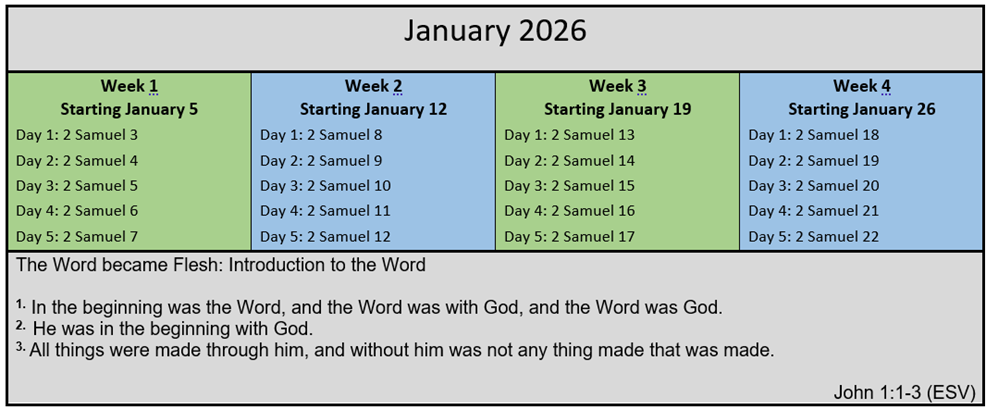 Our reading plan for 2026 will continue through the OT narrative of God’s chosen people as God honors His covenant by blessing them and building them into a sovereign nation. Like all of God’s covenants, God promises blessing for obedience and punishment for disobedience. The children of Isreal were punished by losing their independence many times. They were finally exiled thereby losing much of their individual tribal identity (II Kings 25; II Chronicles 36). Even to this day, we know them as the children of Isreal; as opposed to ones from the tribe of Rueben, Simeon, Levi, etc. God restored them to Jerusalem (Ezra, Nehemiah) but never restored their national independence.